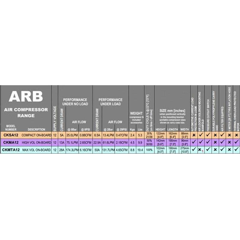 -Diseñado para el inflado de neumáticos y la activación de Air Locker cuando es usado en conjunto con dichos accesorios opcionales -Diseño de motor doble de ARB proporciona una potencia óptima y ofrece un flujo de aire líder en su clase para fines de inflado rápido -Fabricado con materiales ligeros y de alta resistencia -Sellado para una mayor resistencia a la humedad y al polvo -Componentes de calidad para un funcionamiento silencioso y una mayor durabilidad -Motores gemelos incorporan protección térmica interna contra daños extremos a la temperatura -Maxi fusible en línea para trabajo pesado para cada motor proporciona una protección de circuito profesional -Kit de instalado en vehículo con cableado asociado y los accesorios de montaje ARB CKMTA12 On-Board High Performance 12volt Twin Compressor