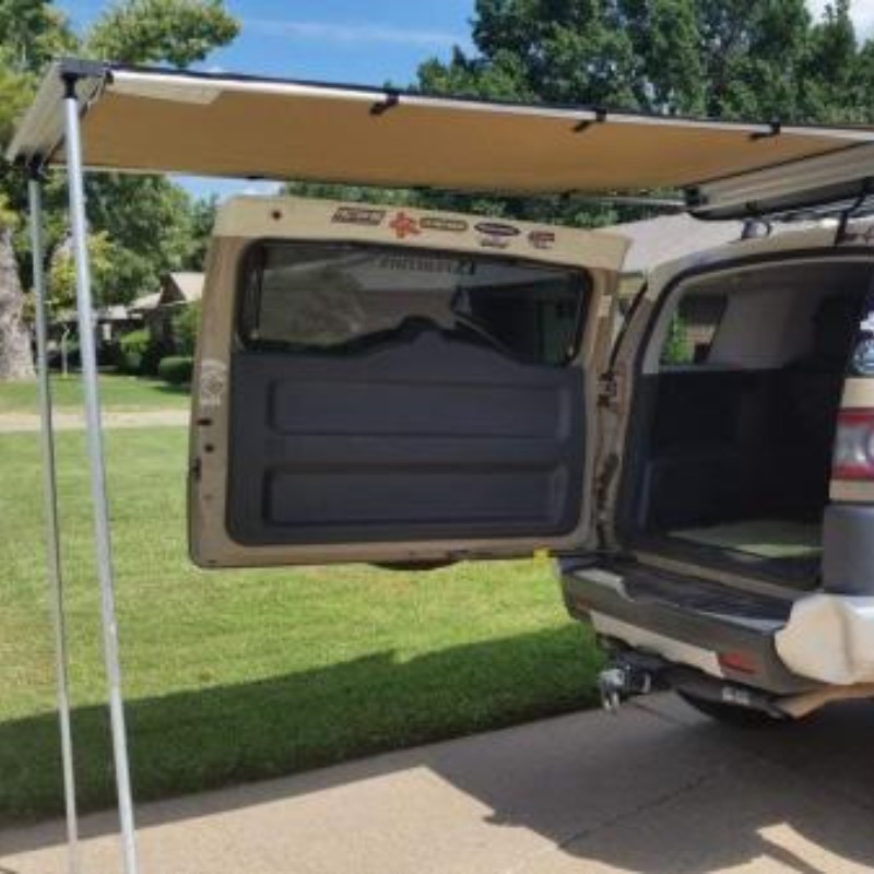 TOLDO LATERAL ARB 1250 (PVC) Disponibles en tres tamaños, grande (2,5x2,5m), mediano (2,0x2,5m) y pequeño (1,25x2,10m). Todos ellos con opción de incorporar cortavientos frontal o lateral (ideal para protegerse de arena y sol), cerramientos (con y sin suelo) y mosquiteras. Toldo enrollable con funda de PVC de cremallera para instalar en la mayoría de vehículos, en el lateral de la mayoría de las barras de techo y bacas portaequipajes. Han sido diseñados específicamente para las duras condiciones de Outback australiano. Los toldos cuentan con patas telescópicas ajustables en altura (aluminio anodizado), tiras de velcro para fijar la lona en el techo, perfiles de aluminio reforzado. El toldo seguarda enrollado en una bolsa reforzada de PVC. Construido a partir de lona resistente PU cubiertas 300gsm poli / algodón. Los toldos son totalmente impermeables y ofrecen una prtoección solar UVP +50. Viene con clavijas y vientos de sujeción para asegurar las patas, tuercas y pernos de montaje de acero inoxidable e instrucciones completas. ACCESORIOS TOLDO (OPCIONALES) ARB-813300 • Cortavientos frontal 1250 mm DIMENSIONES: (1250x2100mm) Altura de mástil (máx): 2,10 m